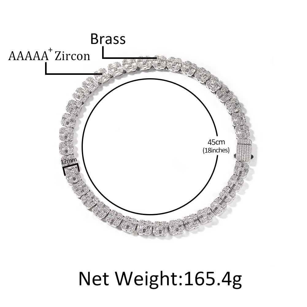 Stand out with the bold and luxurious ICE STONE12mm Iced Out Baguette Tennis Link Chain Necklace, the perfect blend of hip hop style and high-end design. This striking necklace is made from durable brass and plated with your choice of 18K gold, white gold, or rose gold, ensuring a shiny, long-lasting finish. The necklace features baguette-cut zircon stones, set in a graduated design for a captivating effect that shines from every angle.