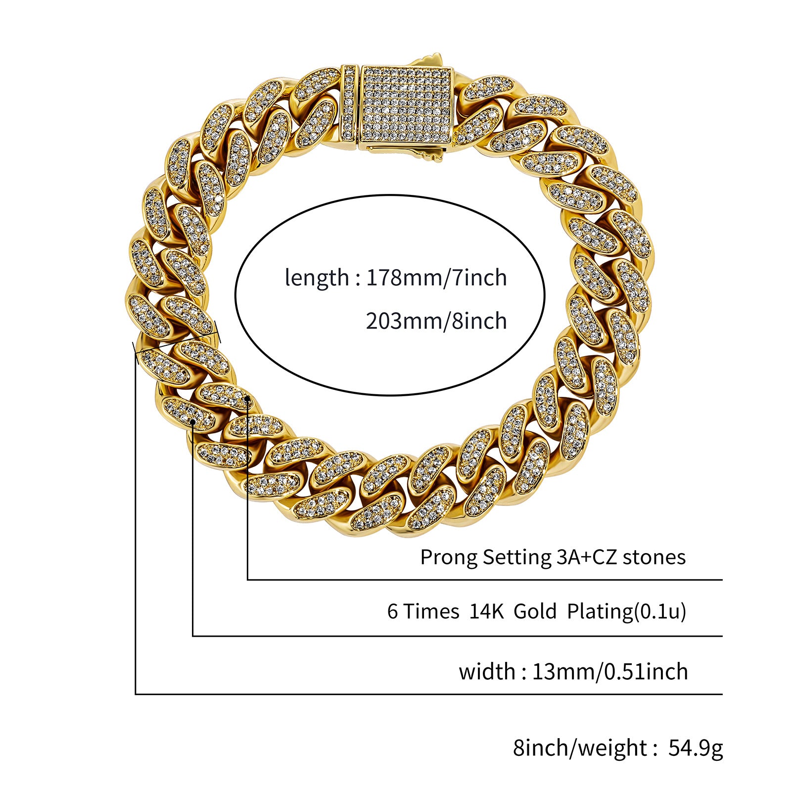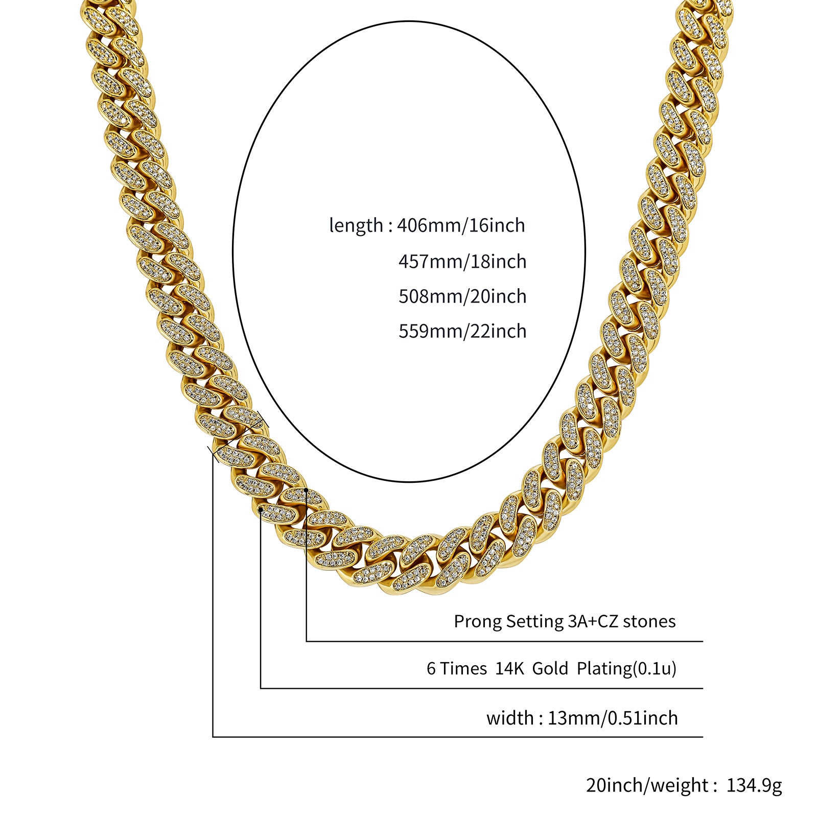 Design & Style: This 13mm Cuban link chain features a two-row design with AAA zircon stones for a full iced-out look, bringing luxury and edge to your wardrobe. Whether for a hip hop-inspired outfit, a party, or a special event, this gold-plated necklace is designed to make you shine.