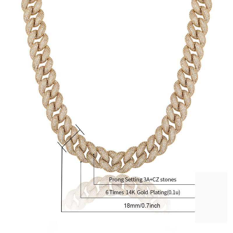 Constructed from premium copper/brass and finished with 14K gold or luxe silver plating, this necklace is built to last—offering long-lasting brilliance without fading. Its thick 18mm width and solid, weighty design make it perfect for rappers, streetwear influencers, and anyone looking to level up their jewelry game.