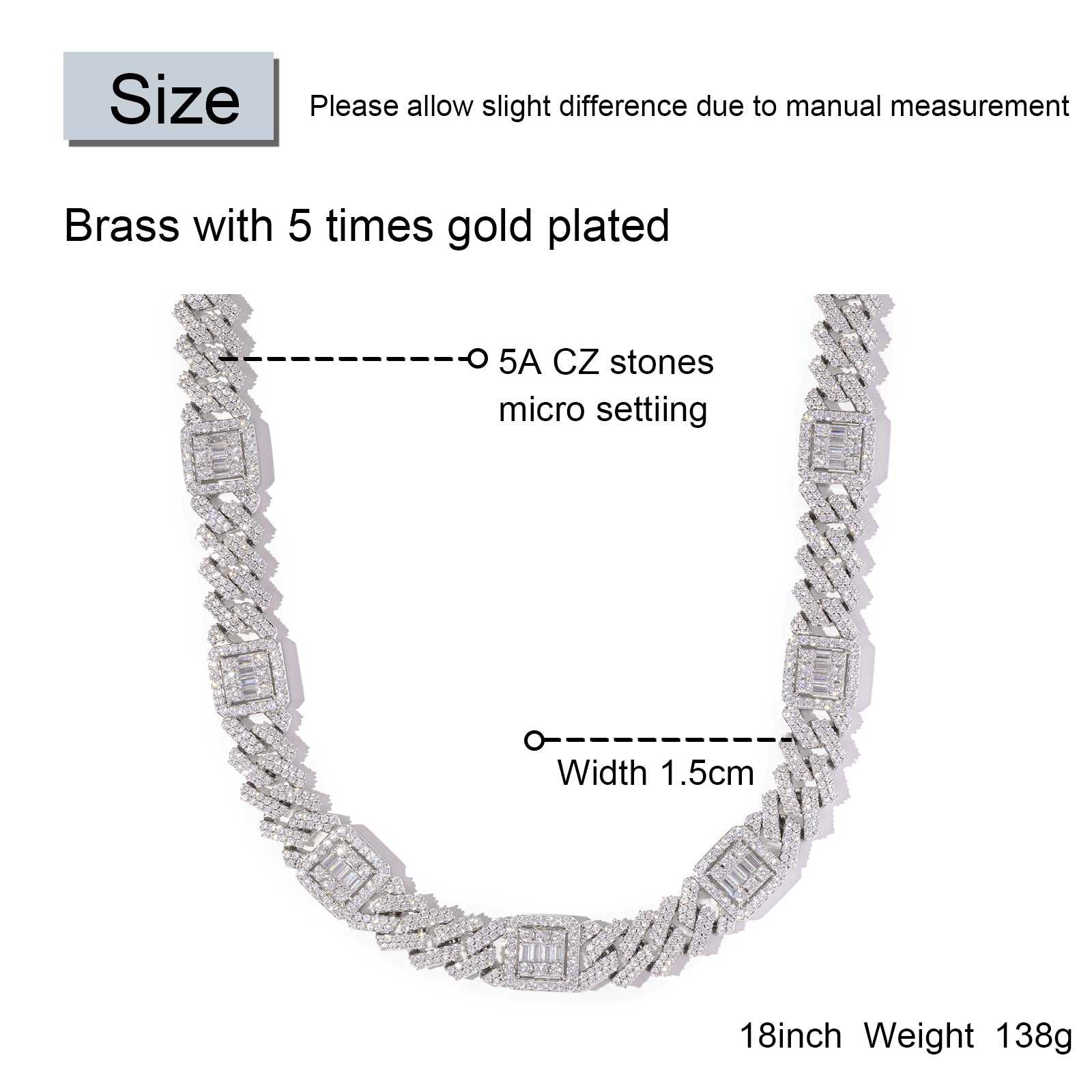 Design & Style: The 18mm Cuban link chain features a unique iced-out design with high-quality cubic zirconia stones, offering a luxurious and timeless look. The box clasp adds a sleek finish to the chain, and the choice of gold or white gold plating provides a premium shine. Whether you want to elevate your everyday look or add something special for a night out, this necklace exudes style and sophistication.