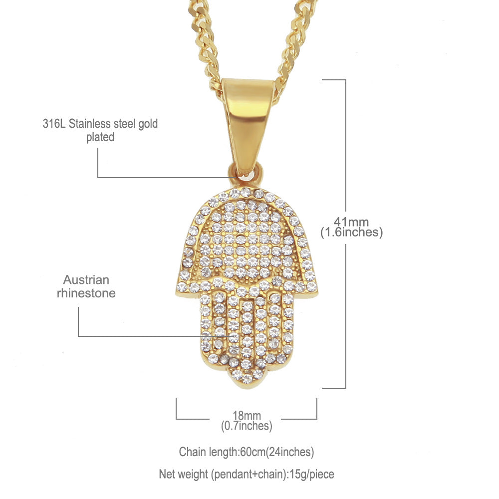 Iced Out Hamsa Hand Pendant Necklace β Gold Cuban Chain Hip Hop Jewelry for Men & Women