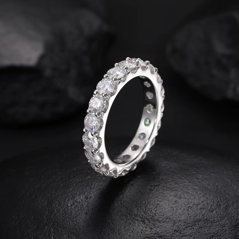 At the center of this icy ring is a 4mm, 0.3 carat VVS1 D-color moissanite, precision-set using a secure prong and micro-insert setting technique. GRA certified and passes the diamond tester, this moissanite boasts fire, clarity, and shine that rivals real diamonds—without the price tag.