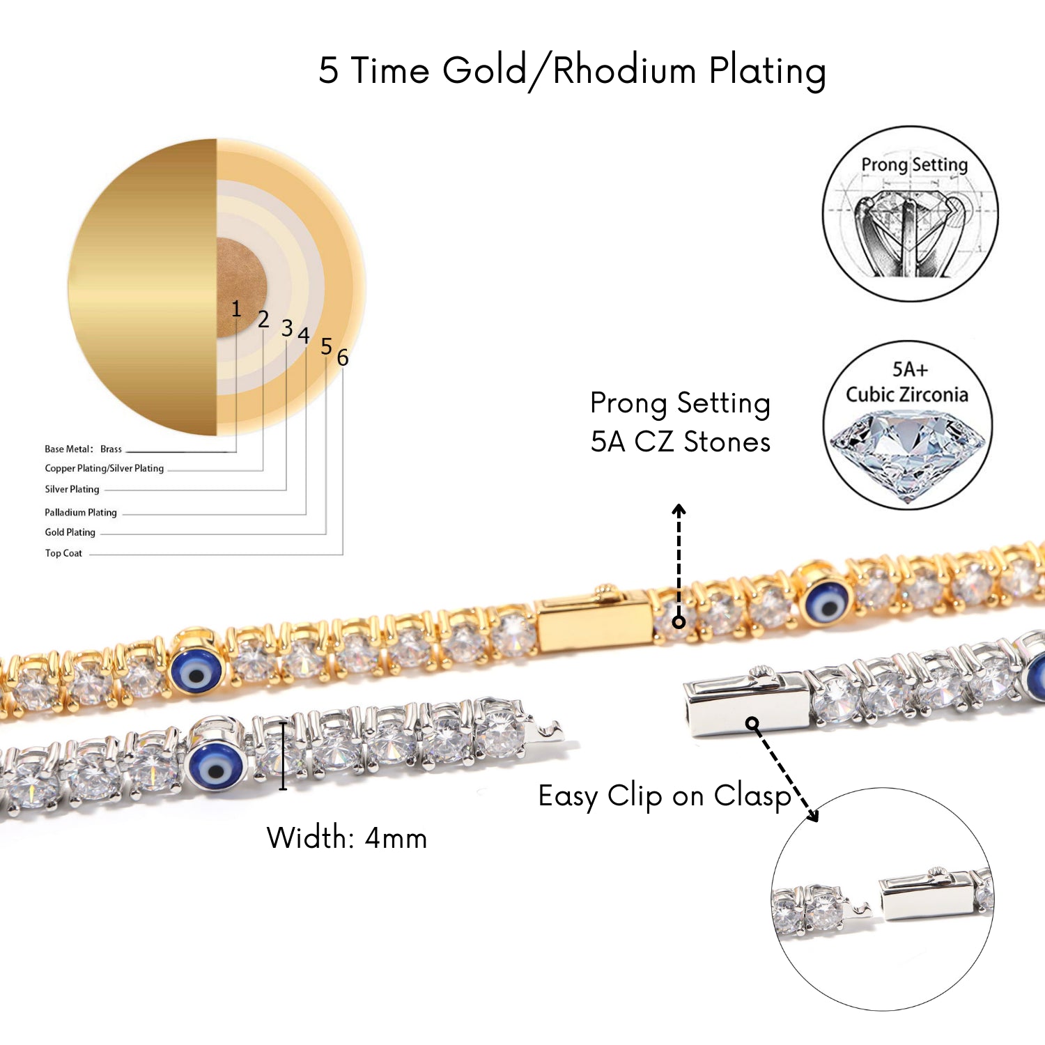 ICE STONE Evil Eye Tennis Bracelet – 4mm Iced-Out, 18K Gold or White Gold Plated, Spring Clasp, INS Hot Design