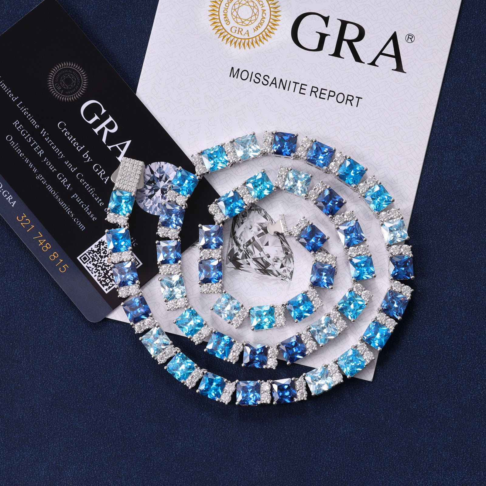 ICE STONE VVS D Moissanite Blue Baguette Tennis Chain Necklace – 925 Sterling Silver Summer Gradient Jewelry