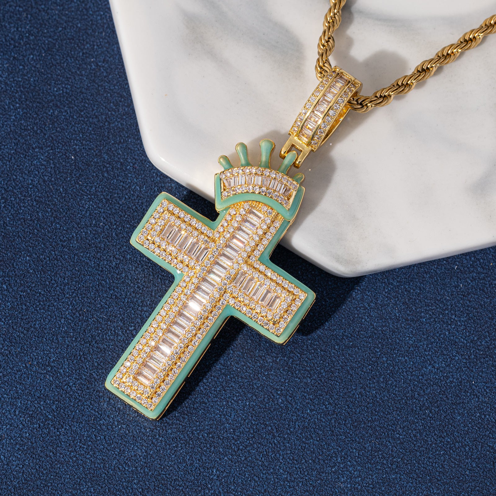 ICE STONE Iced Out Baguette Crown Cross Pendant – 18K Gold Plated Hip Hop Necklace for Men