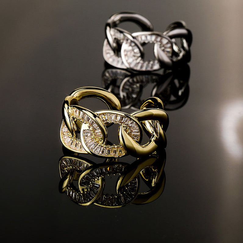 Ideal for weddings, engagements, parties, or simply elevating your everyday look, this ring offers a versatile yet bold design. It is designed to fit any size with its adjustable fit, allowing for a customized wear. Available in white gold and gold plating, it’s the perfect blend of modern luxury and classic elegance.