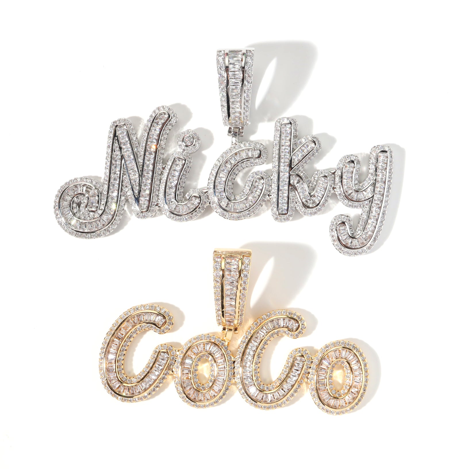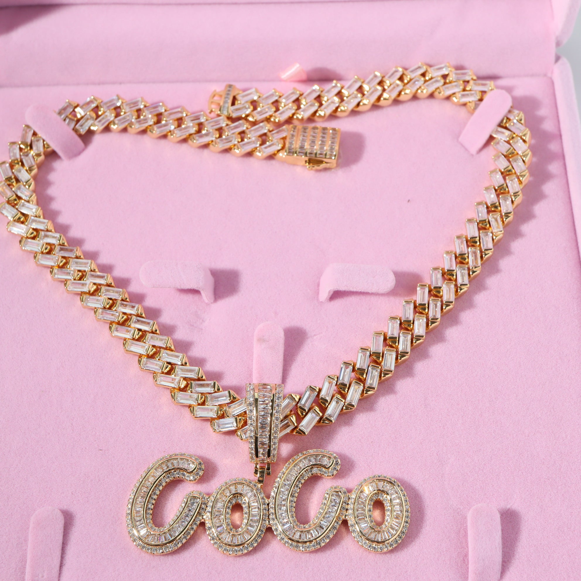 Go bold with the Baguette CZ Brush Font Custom Name Necklace — a large, iced-out nameplate piece that blends hip-hop energy with luxury shine.