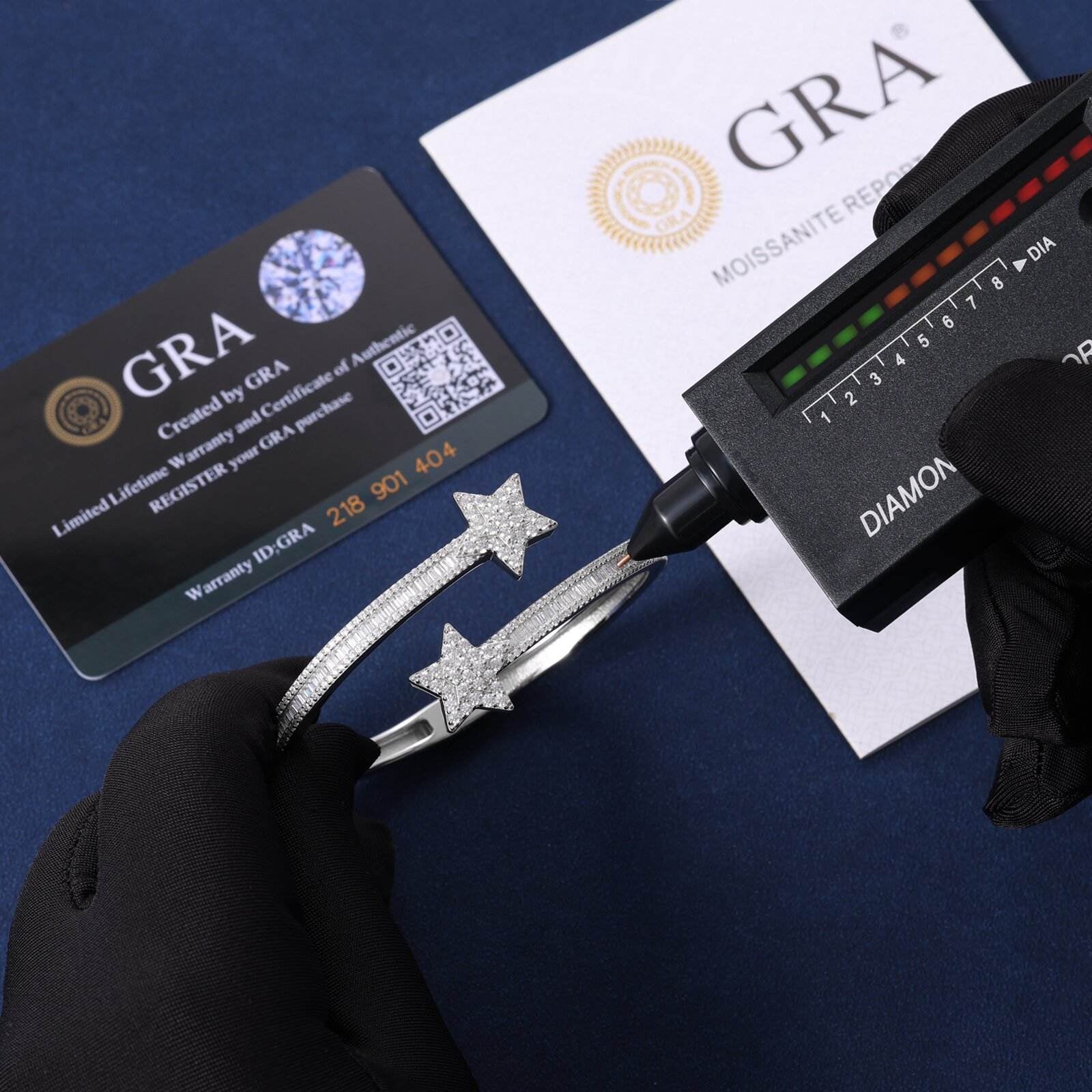 Shine with confidence and style wearing this Exquisite Bling Bling Star Bangle, meticulously crafted from 925 sterling silver and studded with radiant VVS D Moissanite baguette-cut diamonds. The star-inspired design exudes a bold, celestial vibe, blending high-end fashion with daily wear appeal.