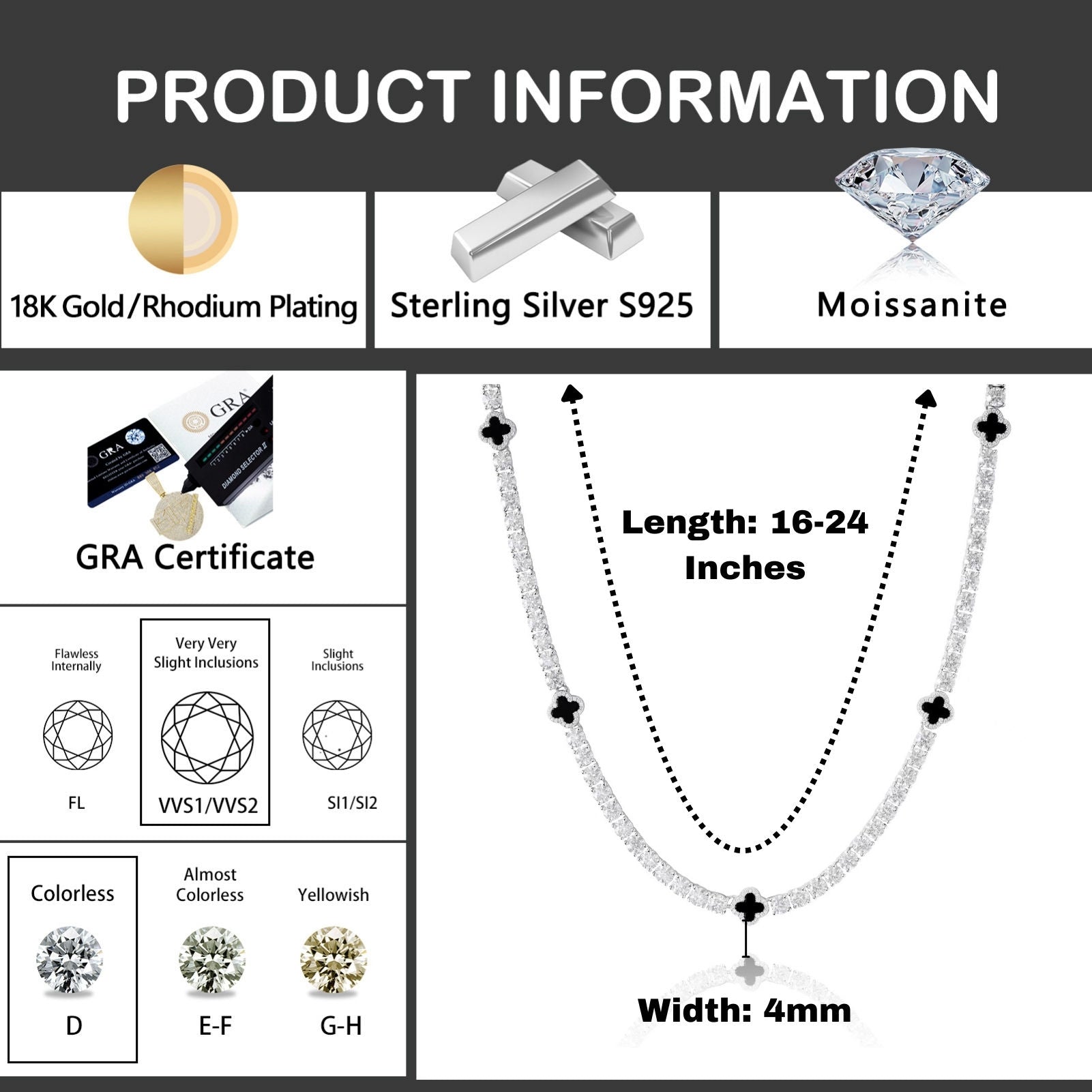 Black Clover Tennis Chain Bracelet – 4mm VVS D Moissanite in 925 Sterling Silver