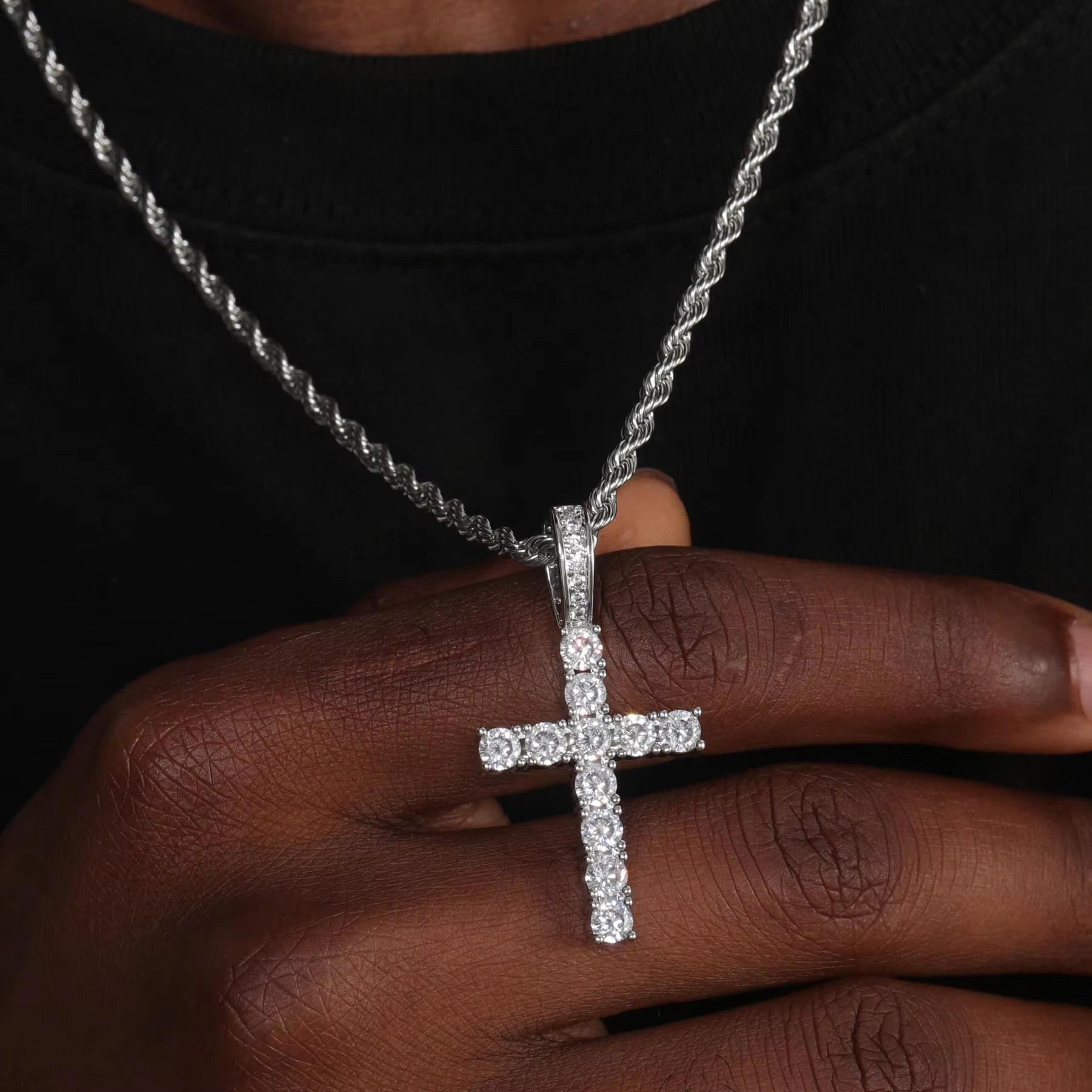 The striking cross design is fully encrusted with 5A zircon stones in a brilliant round cut, securely set using advanced claw setting technology for long-lasting shine and structure. Available with either a rope chain for classic hip-hop energy or a tennis chain for high-gloss elegance, this unisex piece is perfect for both men and women.