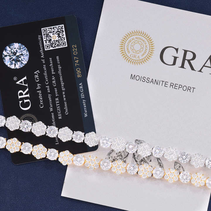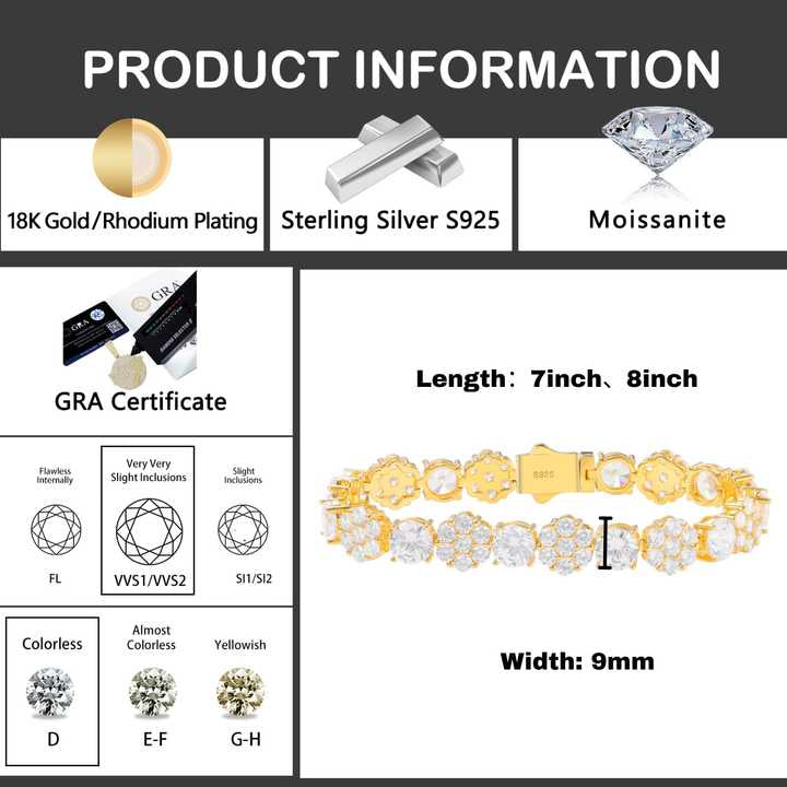 Make a bold statement with this New Cluster Flower Design Bracelet, meticulously crafted with VVS D Moissanite diamonds set in 925 sterling silver. The 10mm width and distinctive cluster flower pattern give it an ultra-luxe, iced-out look that reflects brilliance from every angle.