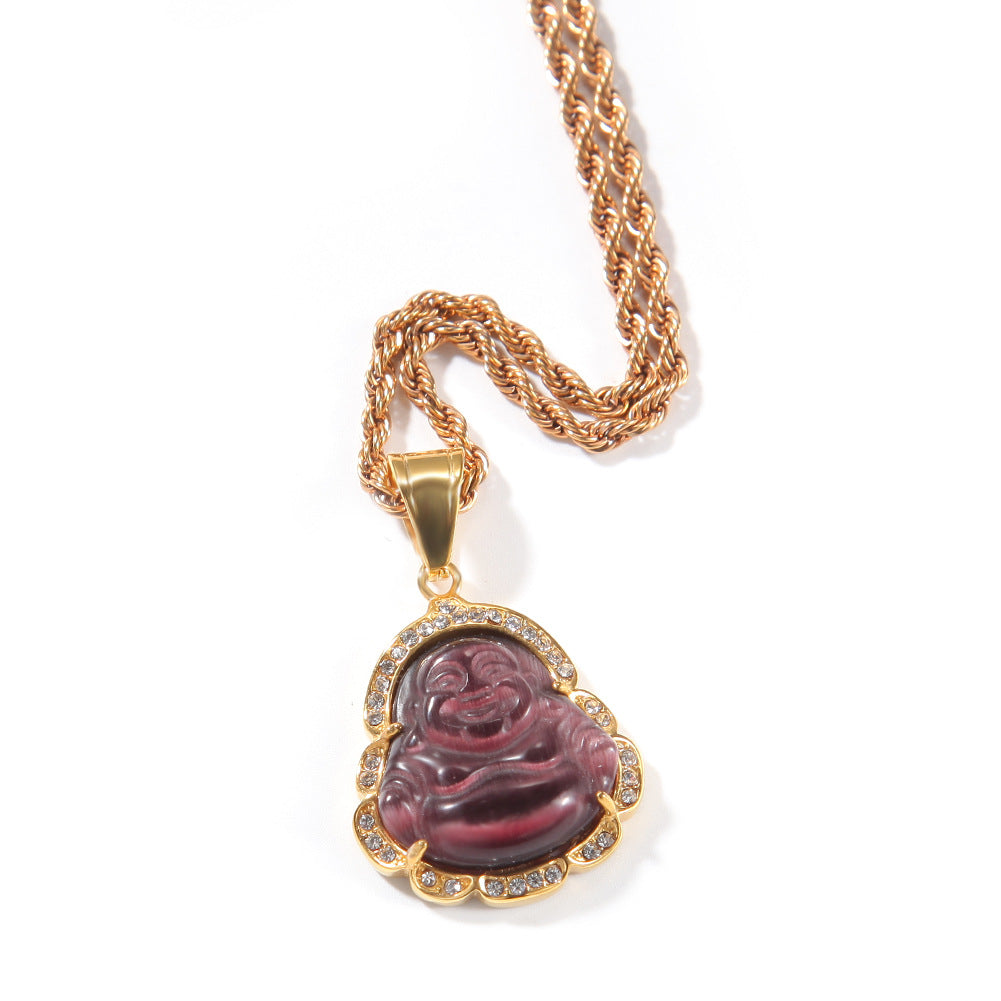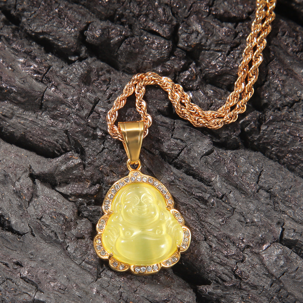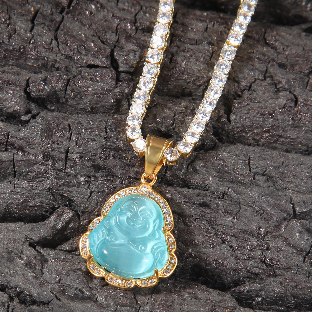Step up your bling game with this vibrant Jade Buddha Pendant, featuring stunning pink, green, and red jade stones set in stainless steel with luxurious 18K gold plating. Expertly crafted with sparkling rhinestones and baguette diamond accents using advanced micro-insert technology, this pendant radiates hip hop style and spiritual energy all at once.