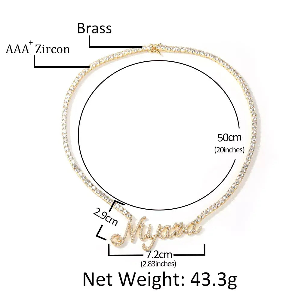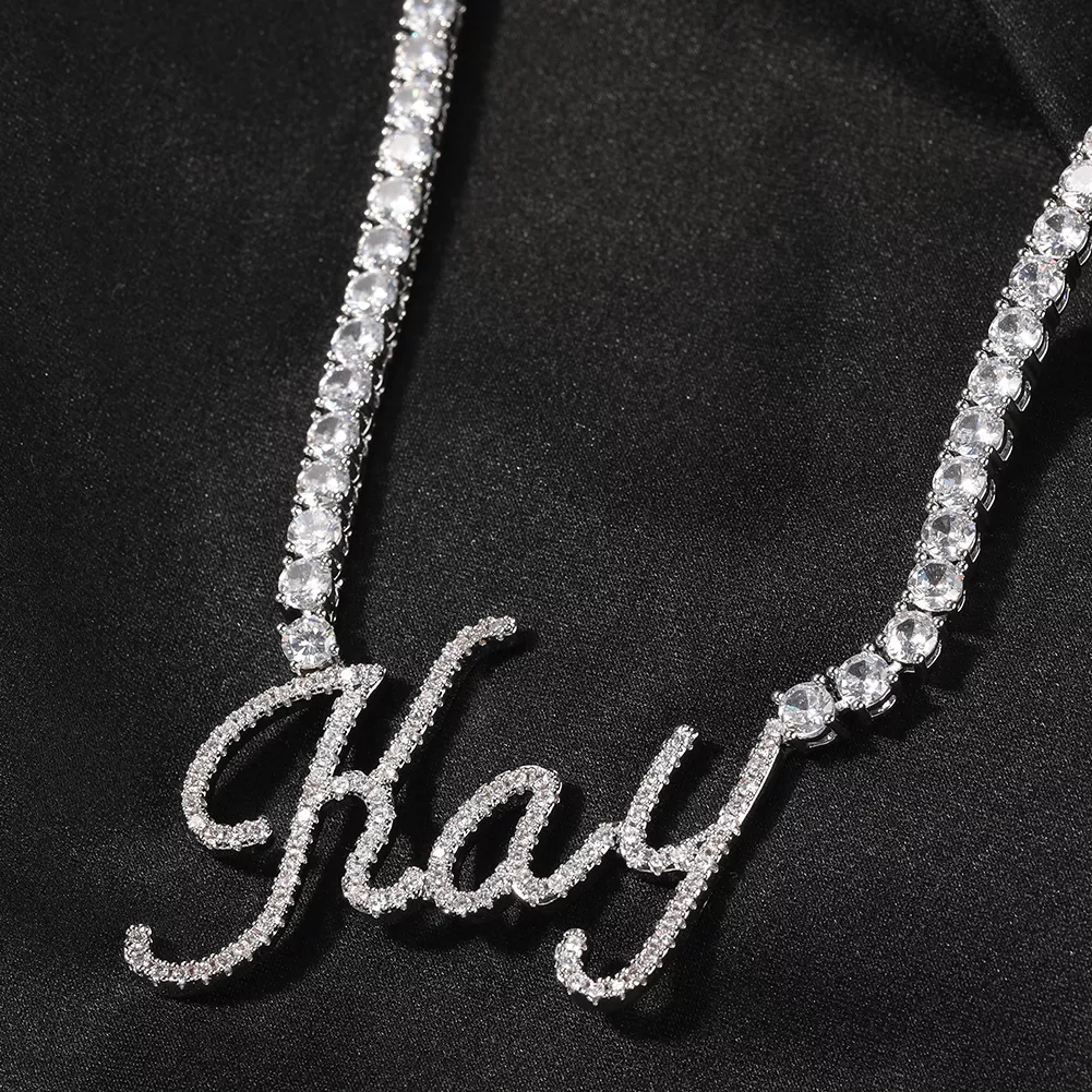 Designed with a flowing brush script and handset AAA zircon stones, this iced-out nameplate sparkles with every movement, perfect for turning heads and making a statement.
