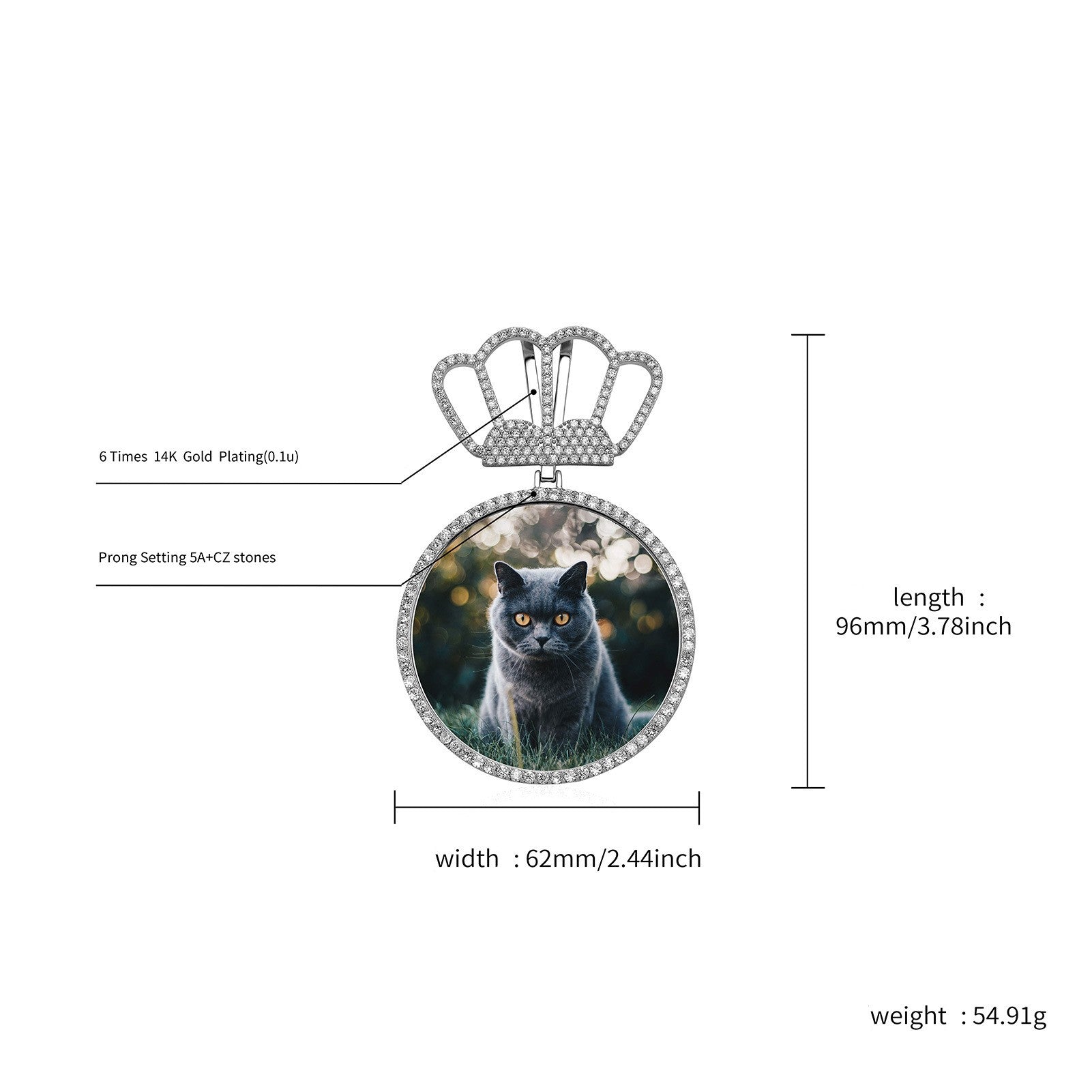 Create lasting memories with the Custom Photo Pendant Necklace. This personalized jewelry piece allows you to immortalize your favorite photo, making it a perfect anniversary gift, engagement present, or special keepsake. Crafted from high-quality brass and plated with 18K gold or rhodium, this pendant features cubic zirconium for an added touch of sparkle and luxury. The pendant is a unique hip hop jewelry style that captures your memories in a crown design for an exclusive and timeless look.