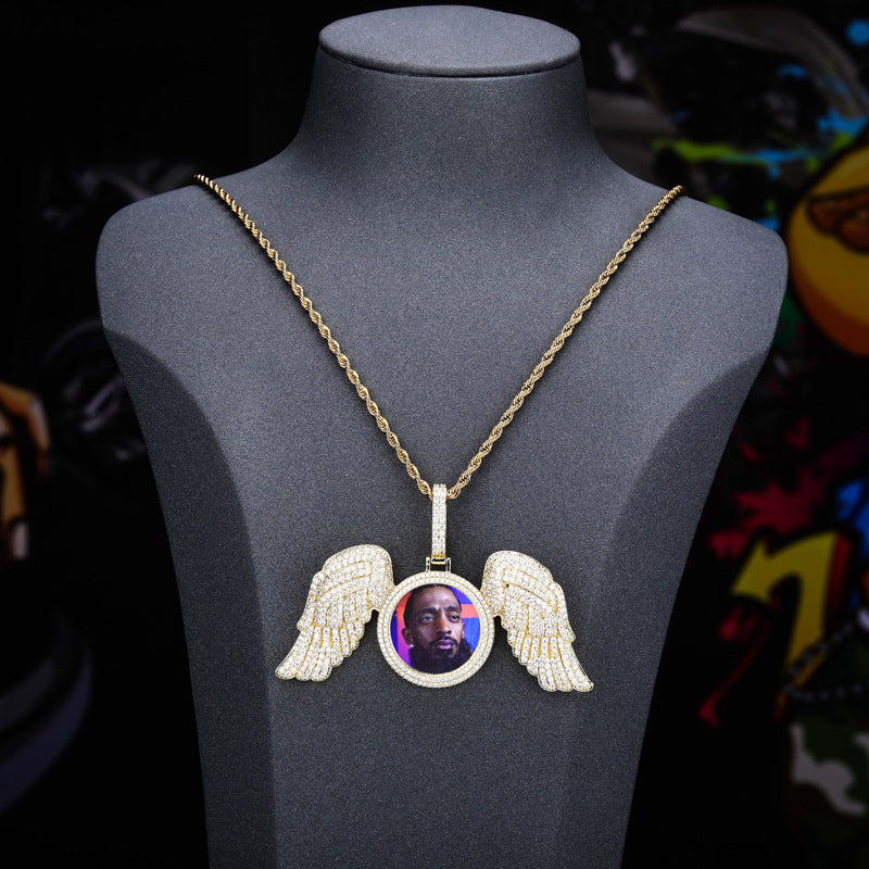 Custom Photo Pendant Necklace with Big Wings | Iced Out Hip Hop Jewelry | 18K Gold Plated for Men & Women