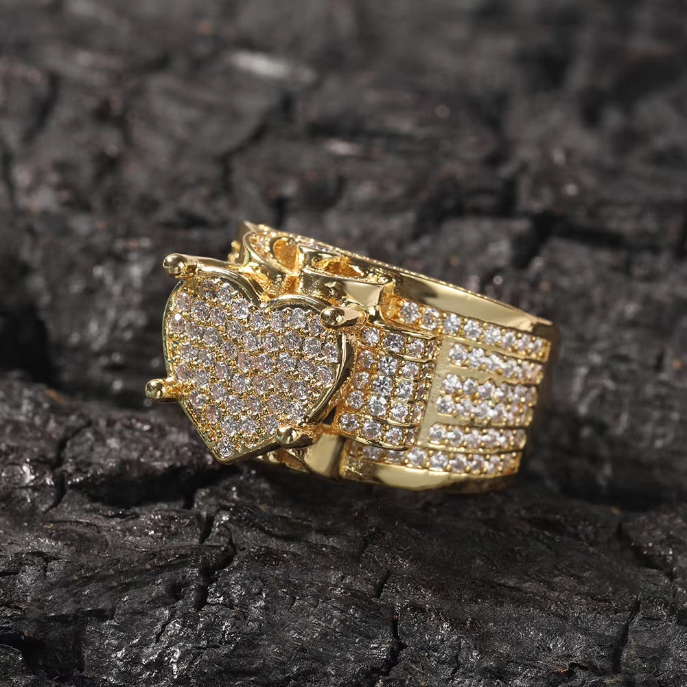 European American Hip-Hop Style Micro-Inlaid Zircon Heart Ring Full Diamond Retro Gold-Plated Jewelry for Gift