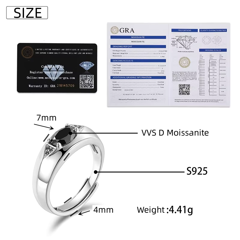 Main Stone: Black VVS D Moissanite (Round Brilliant Cut)