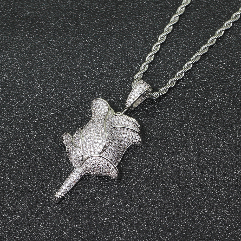 Gold Pink Rose Flower Petals Necklace & Love Pendant – Iced Out Cubic Zircon Bling Hip Hop Jewelry with 3mm Rope Chain