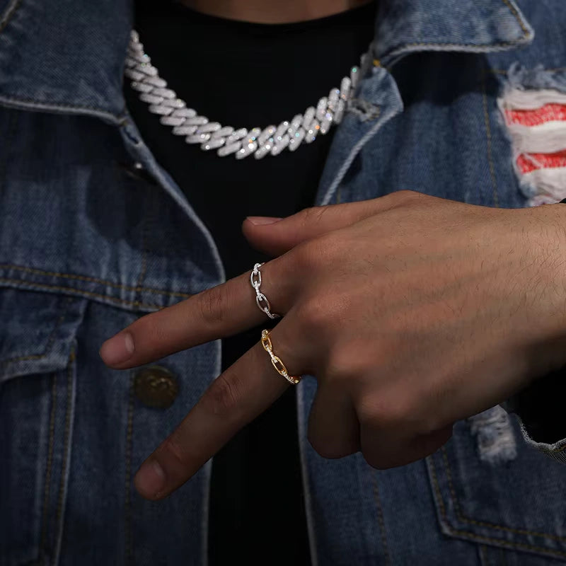 Bring the heat with this ICE STONECuban Link Ring, a standout piece crafted from 925 Sterling Silver and drenched in VVS round brilliant-cut Moissanite stones. With its micro-insert stone setting and gold or white gold plating, this unisex ring delivers next-level shine and passes the diamond tester—making it the ultimate blend of fire and finesse.