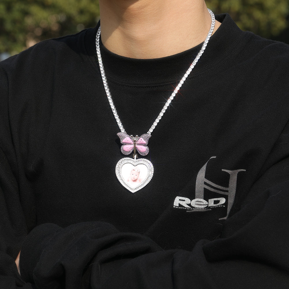 Celebrate your love and cherished memories with the Heart Hook Butterfly Hook Heart Shape Photo Pendant Necklace. Designed for those seeking a meaningful yet stunning accessory, this couples necklace features a heart-shaped pendant enhanced with delicate butterfly hook details. The pendant is adorned with 5A cubic zirconia stones, providing an eye-catching iced out sparkle.
