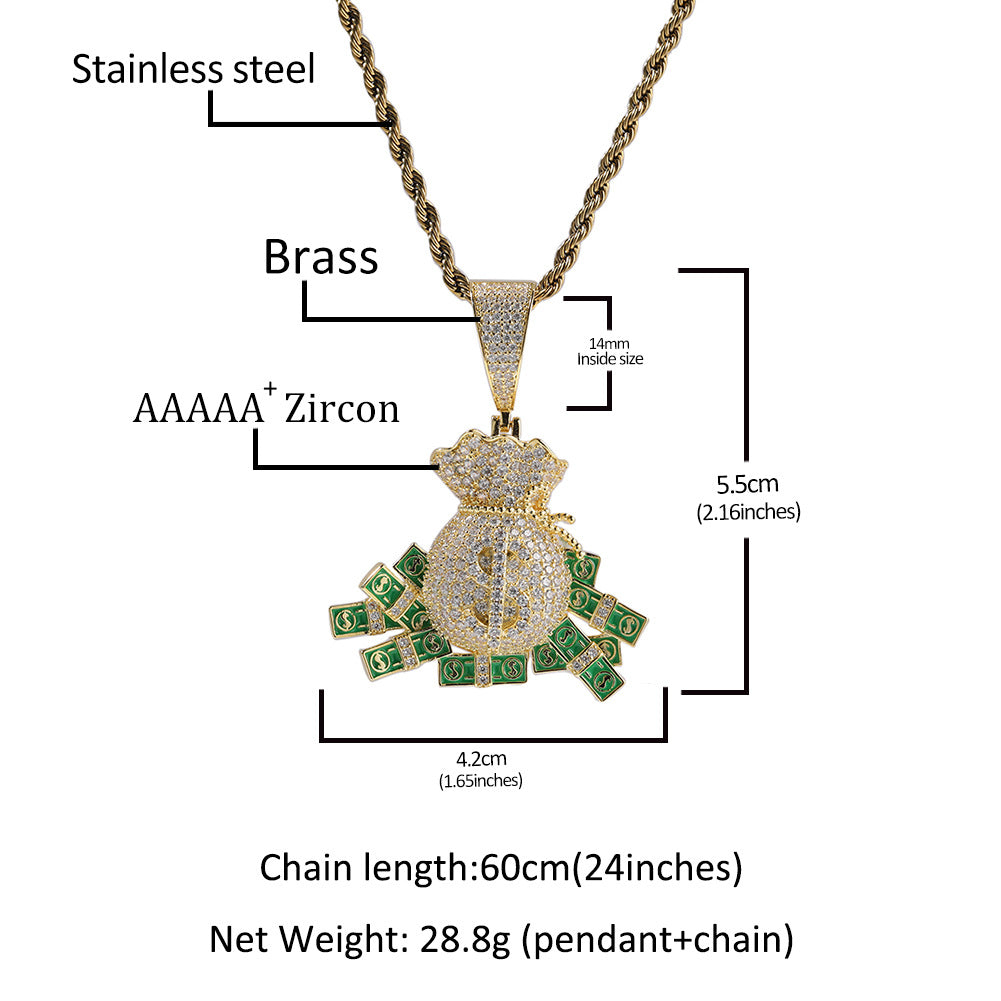 Hip Hop Jewelry, Money Bag Pendant Necklace, Dollar Design Pendant, Bling Wallet Pendant, CZ Diamond Pendant, Brass Gold Plated Necklace, Hip Hop Jewelry for Men, Women, Unisex Pendant, Zircon Pendant Necklace