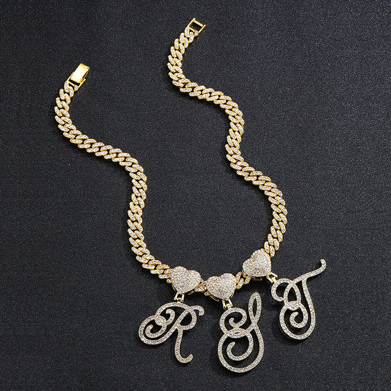 Add a touch of luxury and personal flair with the Hip Hop Initial Cursive Letter Heart Pendant Necklace. This iced-out necklace features A-Z cursive letter pendants, each adorned with rhinestones that sparkle like diamonds. The heart-shaped design makes it a standout piece, perfect for personalizing your style and showcasing your initials or those of someone special.