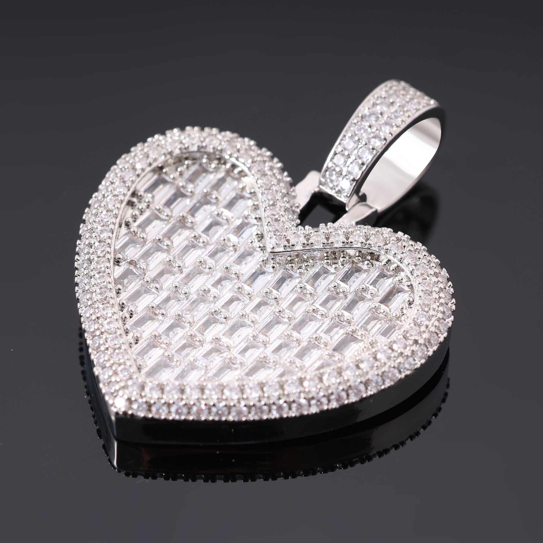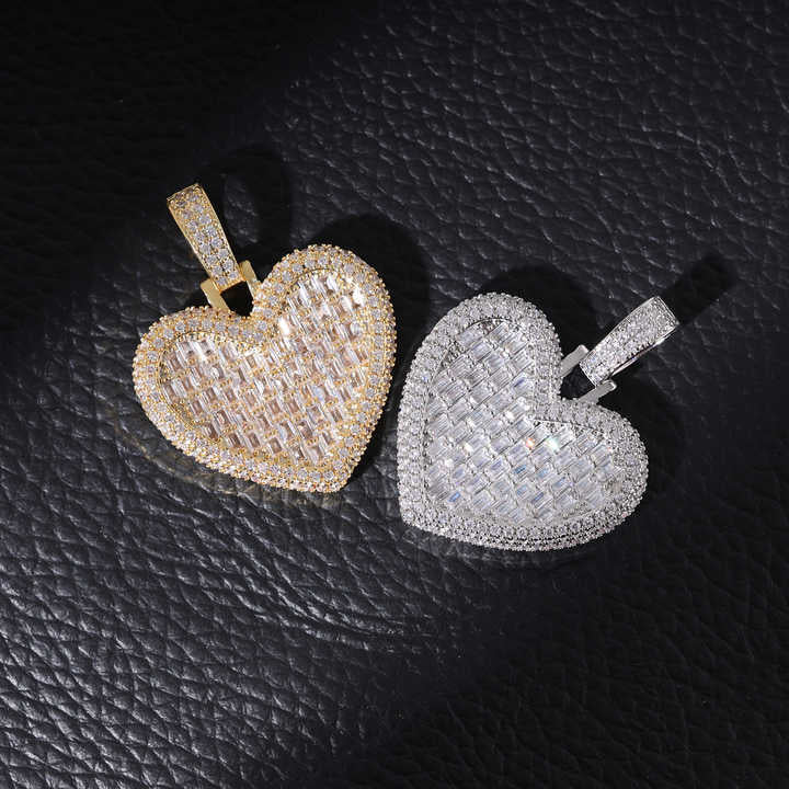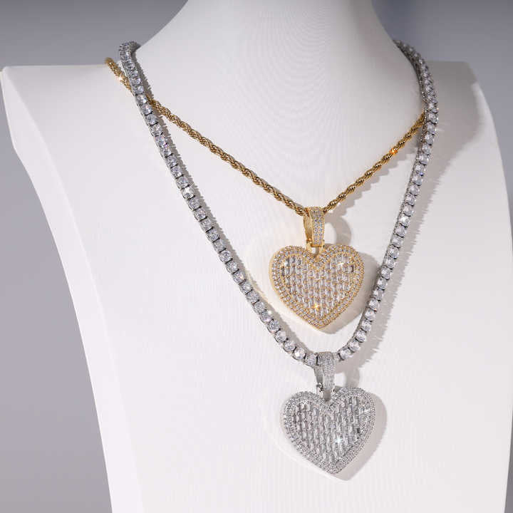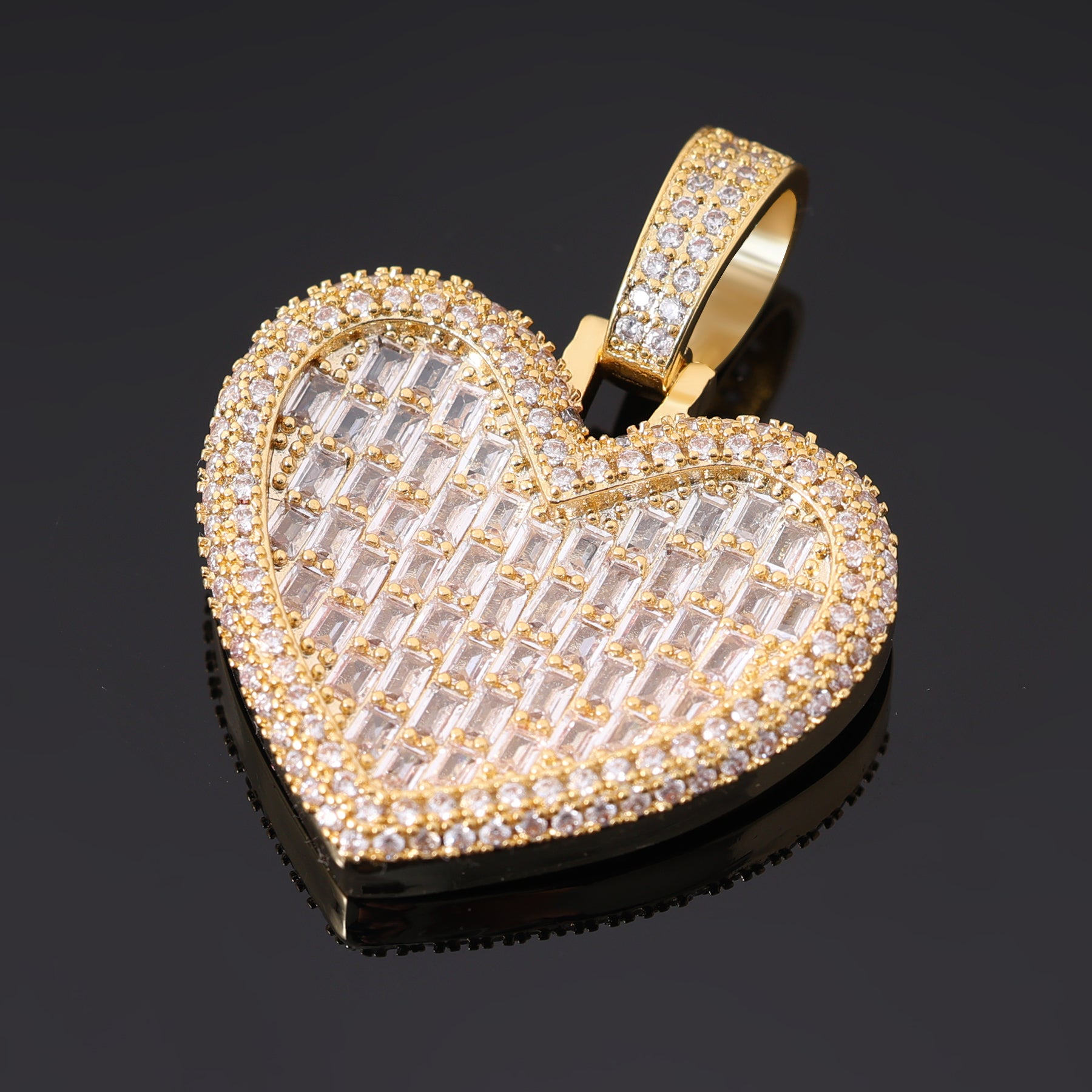 Embrace elegance and charm with the ICE STONE Iced Out Baguette Small Heart Pendant Necklace. Crafted from brass and plated with 18K gold, this stunning pendant features a small heart design with baguette-cut cubic zirconia (CZ) stones. The stones are expertly set using micro inlay technology, giving this piece a polished, high-end finish. The round brilliant cut CZ stones add an extra sparkle, creating an eye-catching effect that elevates your jewelry collection.