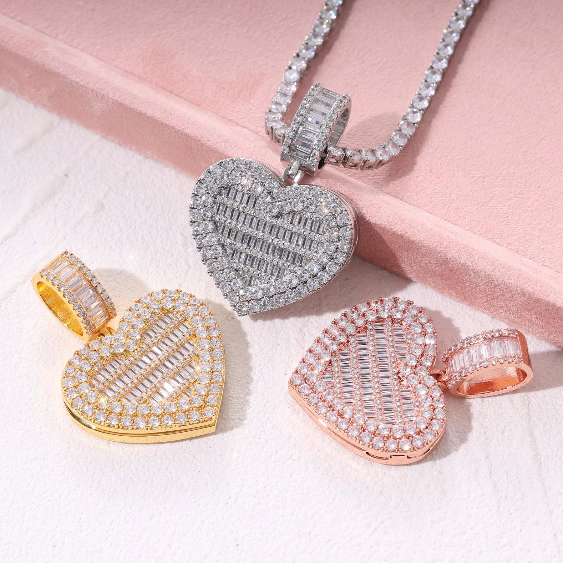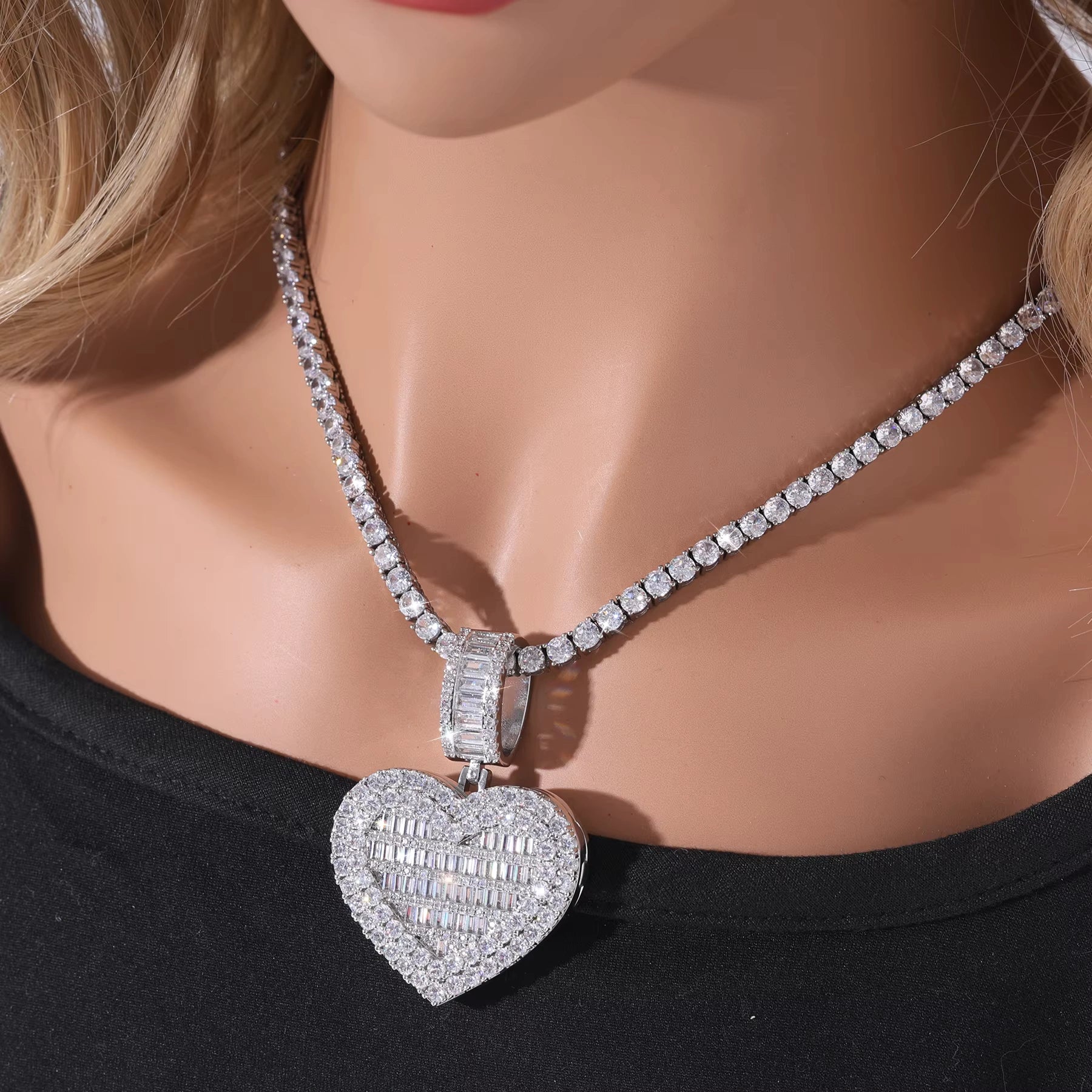 Iced Out CZ Flip Heart Photo Lockets Necklace Fashion 5A Baguette Zircon Diamond Empty Memory Photo Frame Pendant
