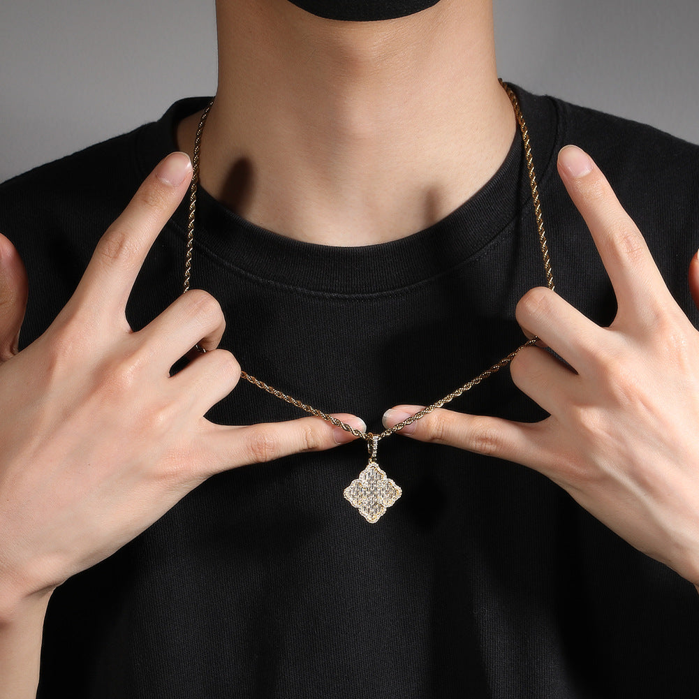 Iced Out Four Leaf Clover Pendant Necklace | Hip Hop Jewelry | Flower Shape Necklace with Gold Plated Finish | For Men & Women