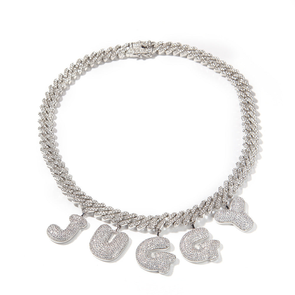 Crafted from brass and plated with gold or silver, this iced-out letter necklace is adorned with cubic zirconia stones, creating a captivating, sparkly effect. The bubble shape letters offer a unique, playful twist on a classic style, while the 12mm Cuban chain adds a touch of luxury and strength to the overall look.