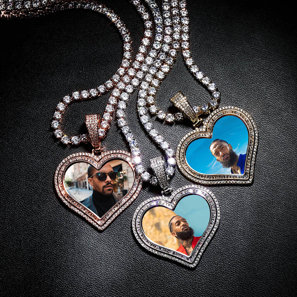 Turn your memories into a bold fashion statement with the Luxury Heart-Shaped Custom Picture Pendant. Crafted with precision and love, this pendant features a heart-shaped design iced out with sparkling zircon stones and plated in rich 18K gold, rhodium, or rose gold. Perfect for gifting or keeping someone special close to your heart, this custom piece blends sentimental value with hip hop flair.