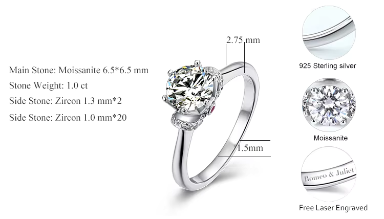 Main Stone: Heart-Cut Moissanite Diamond (6.5 × 6.5mm, 1.0ct)
