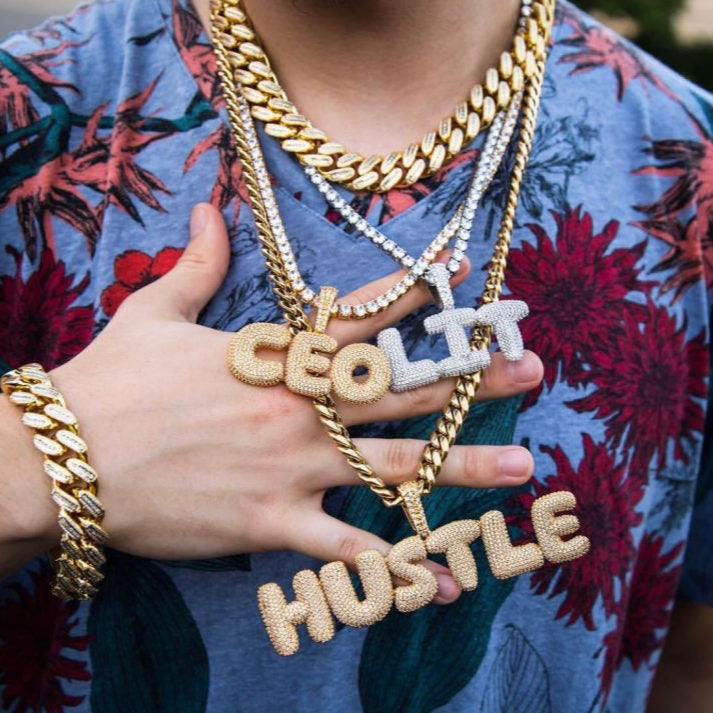 Crafted with brass and plated in 18K gold, rhodium, or rose gold, this necklace is designed to capture attention. The iced-out crown adds a royal touch to the initial, while the brush font and heart diamond elements bring a unique charm to this custom name pendant. Perfect for men, women, or children, this personalized necklace makes a stylish addition to any collection, especially for those who appreciate hip hop flair.