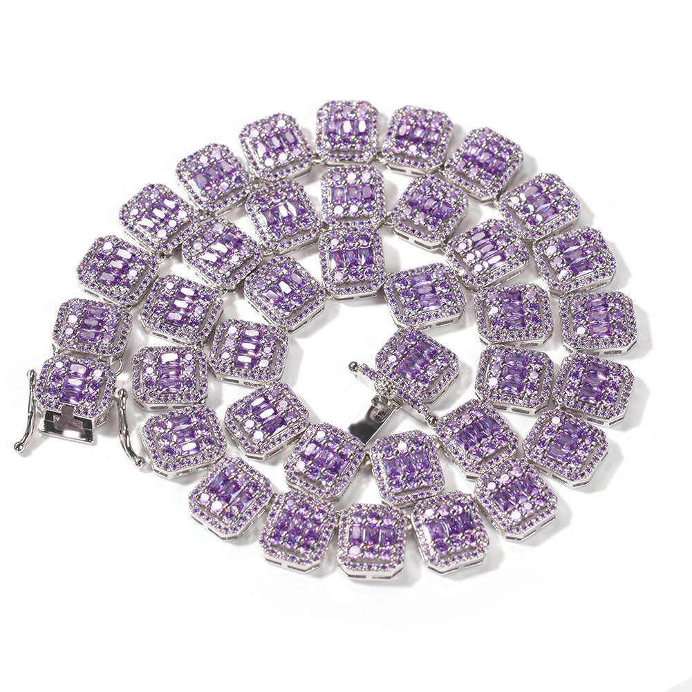 Make a bold fashion statement with the Micro Paved CZ Personalized Hip Hop Necklace. This custom name necklace is a perfect blend of elegance and street style, featuring purple custom brush cursive letters and micro paved cubic zirconia for a brilliant sparkle. The two-tone 18K gold-plated and rhodium-plated finish adds a luxe touch, while the baguette chain offers an extra level of sophistication.