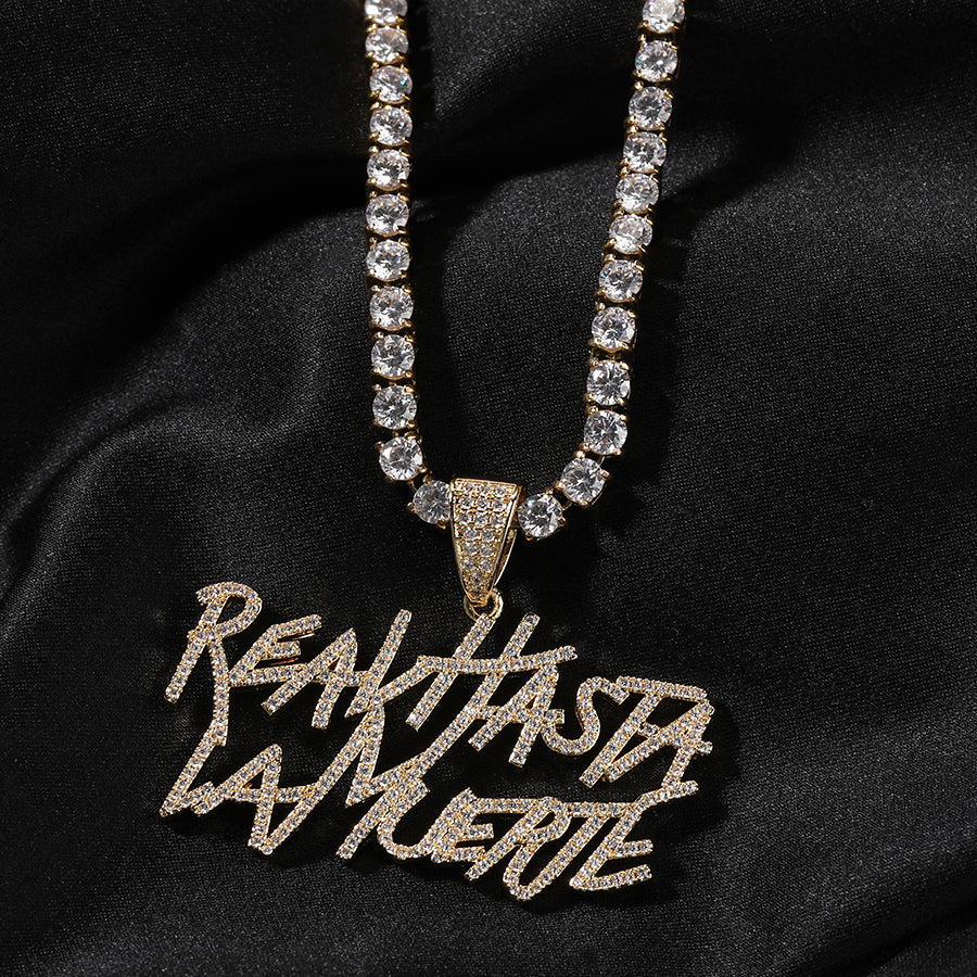 Celebrate your love for music and style with the Hasta La Muerte Anuel AA Pendant Necklace, a must-have piece for any hip hop jewelry enthusiast. This bold pendant, inspired by Anuel AA's iconic phrase, features 5A cubic zirconia (CZ) stones meticulously set in a claw setting for maximum sparkle. The pendant is crafted from high-quality brass and plated with 18K gold, ensuring both durability and luxury. With its street-savvy design, this piece offers an undeniable hip hop vibe perfect for both men and women.