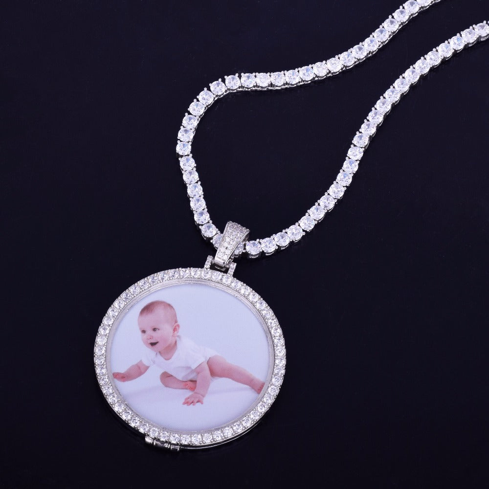 Capture your cherished memories in style with the Top Quality Edge CZ Zircon Paved Custom Photo Pendant Necklace. This pendant features a round shapedesign, paved with high-quality cubic zirconiumstones that offer a dazzling, iced-outeffect. The custom photofeature allows you to personalize it with your favorite picture, turning this necklace into a memory giftfor any occasion.