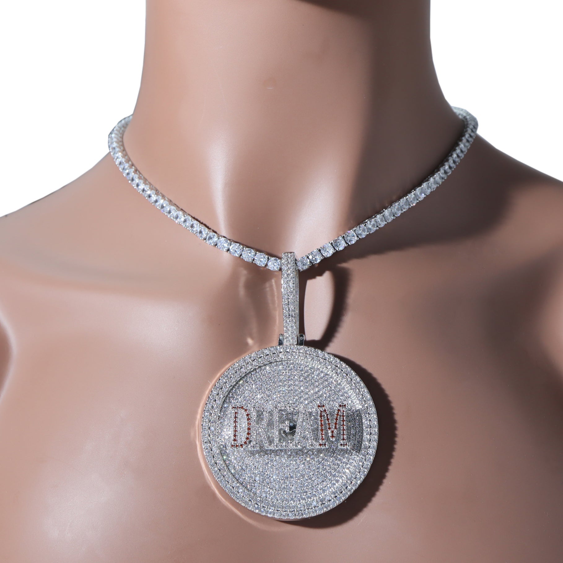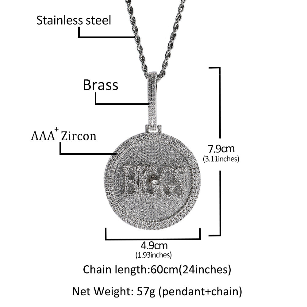Make a statement with the Round Shape CZ Iced Out Pendant Necklace – a fully personalized, hip-hop-inspired piece that combines luxury and bold style.