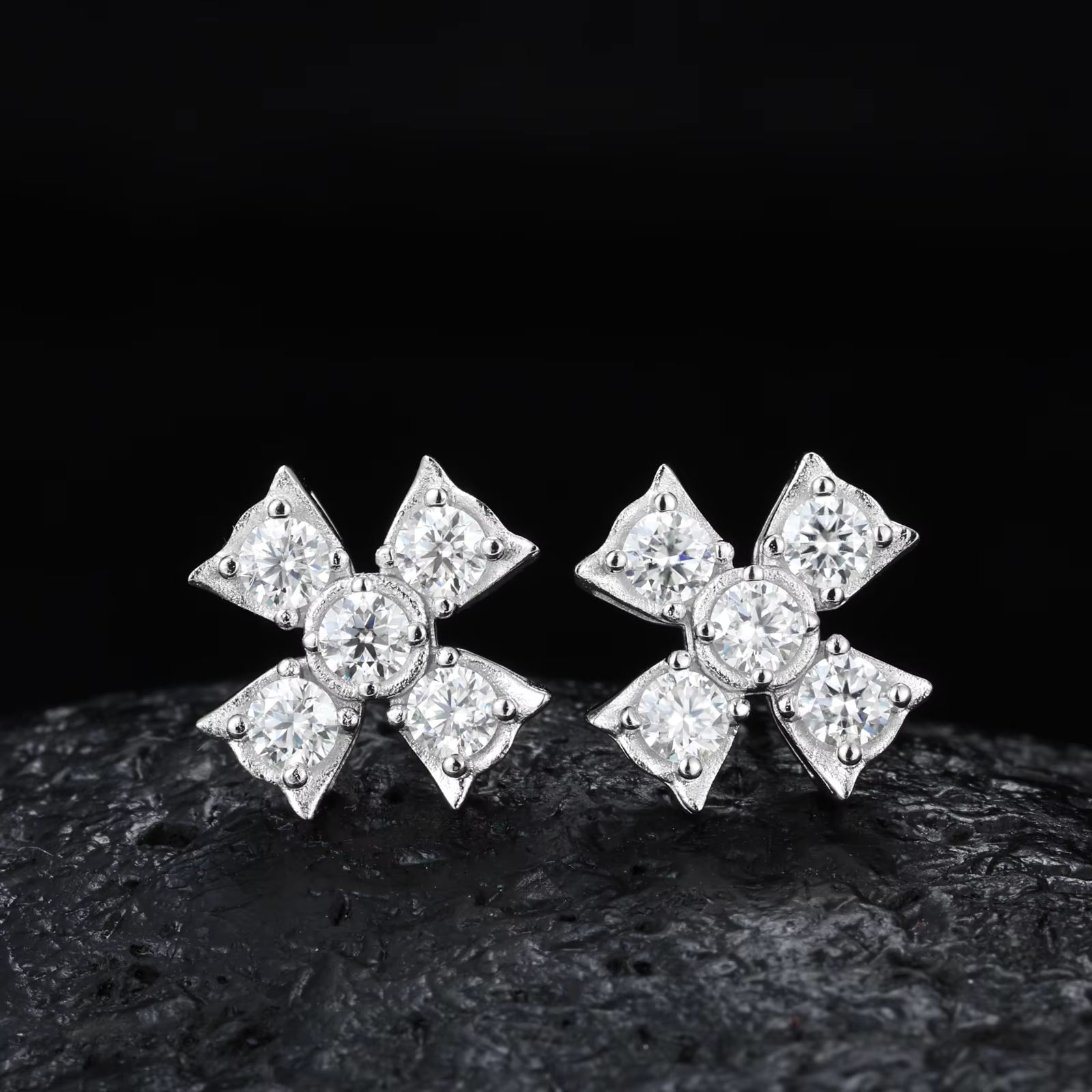 Shine with elegance and charm in these New Design Four Leaf Flower Moissanite Earrings by ICE STONE. Crafted from premium 925 sterling silver and adorned with VVS D Moissanite diamonds, these sparkling stud earrings combine hip hop fashion with timeless floral beauty. Ideal for weddings, anniversaries, parties, and gifts, they feature a claw setting that enhances the brilliance of each oval-cut stone.