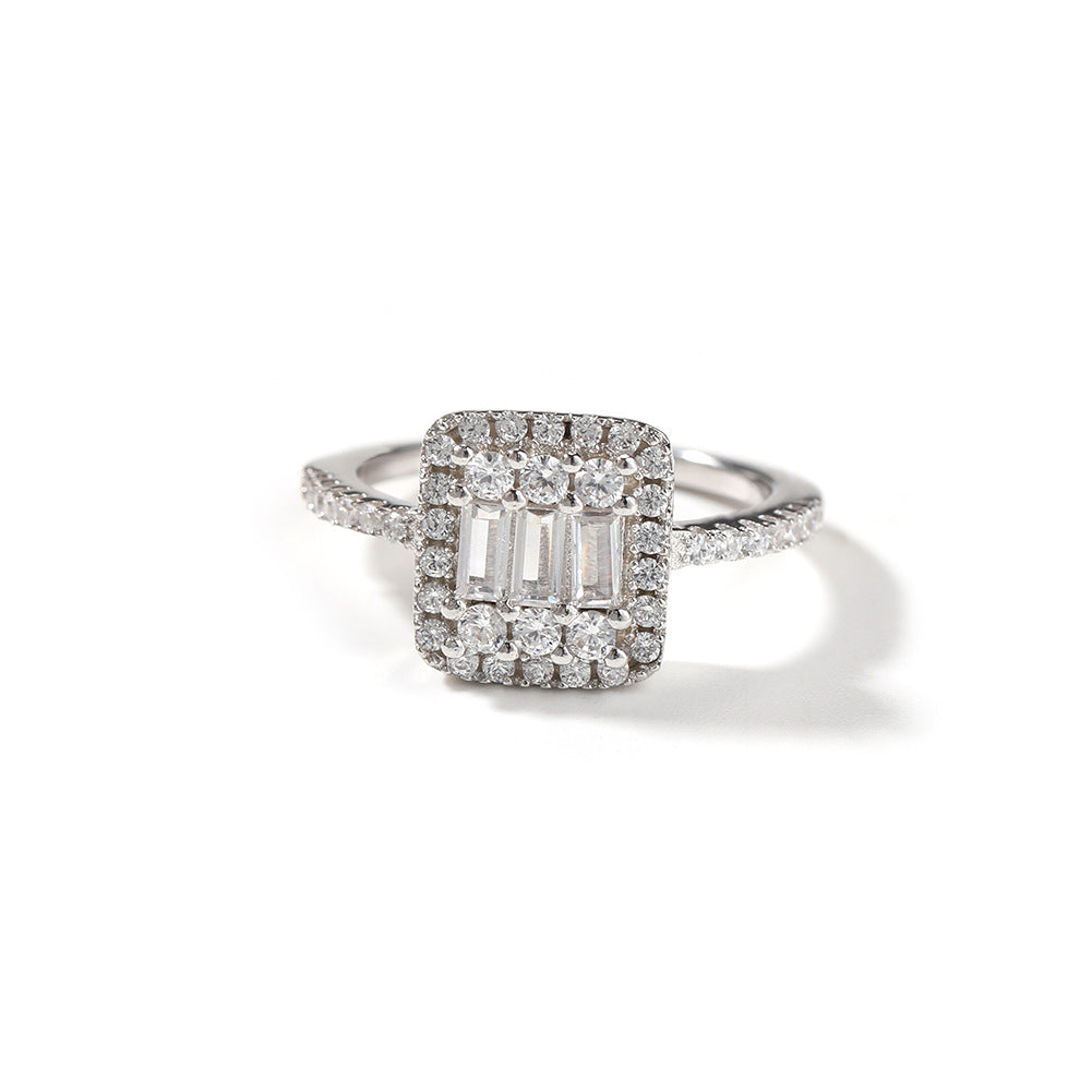 This iced-out engagement ring is the ideal choice for someone looking for a classic, timeless design with a modern touch. The square baguette stones add a sophisticated edge to the gold-plated finish, making it perfect for women who want to stand out with a luxurious and glamorous accessory.