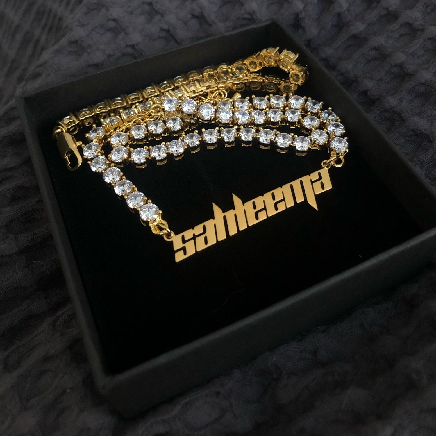Make it personal. Make it bold. This custom name necklace with a tennis chain delivers unmatched shine and statement-making style, perfect for any occasion.