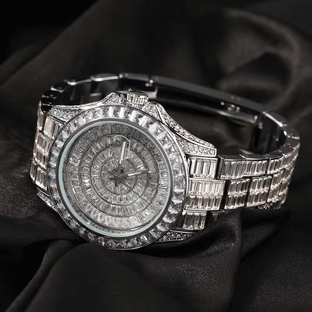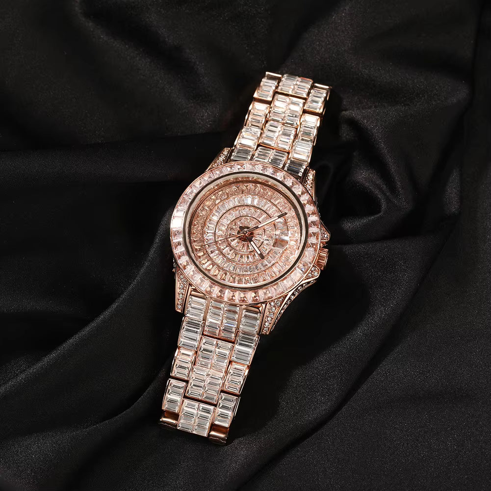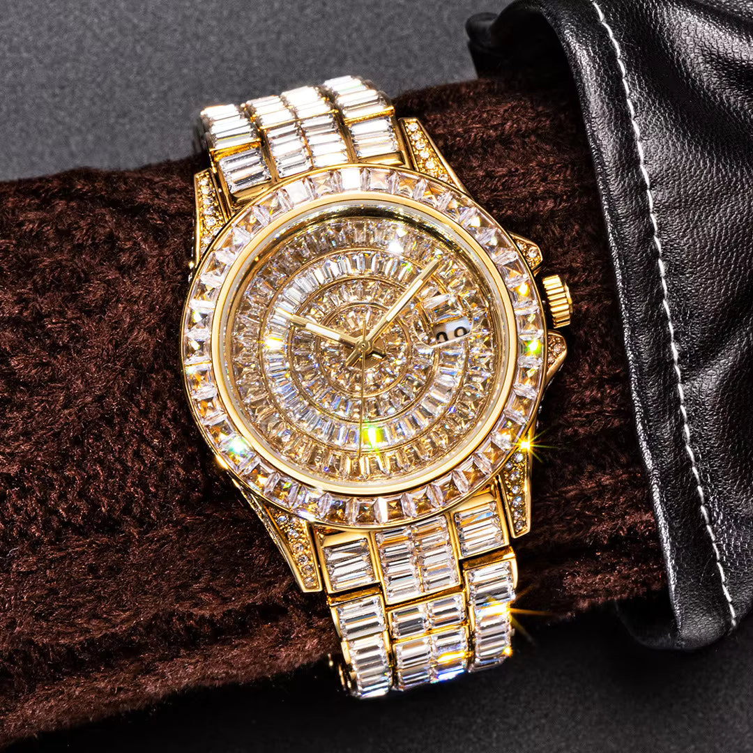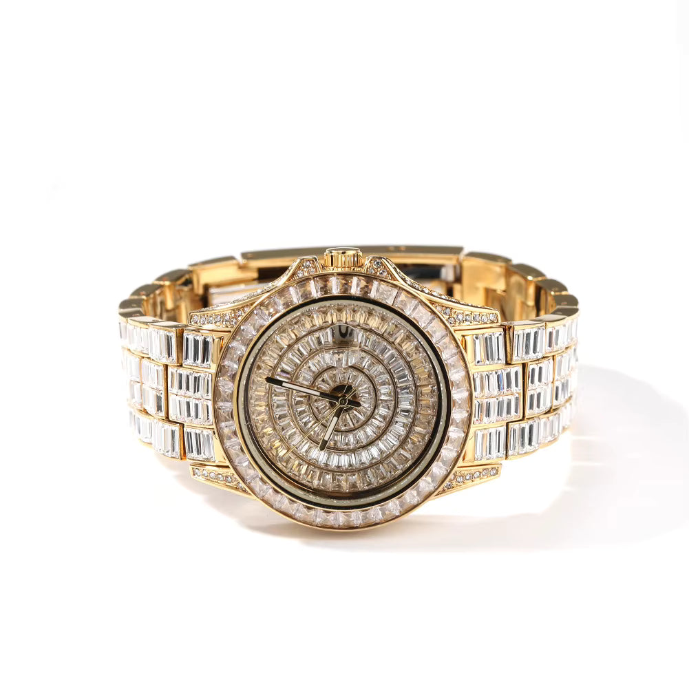Unique Design Super Shiny Bling Watch Iced Out Full baguette Rhinestone Hip Hop Gold Luxury Diamond Watch Women Men