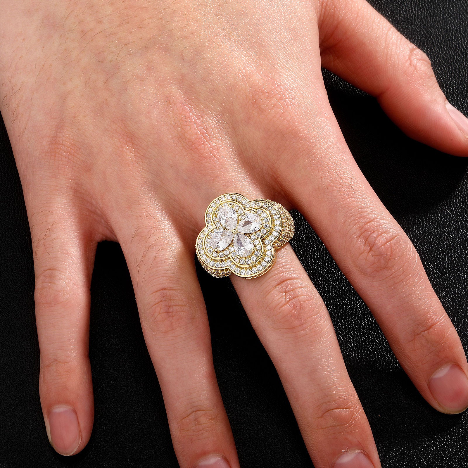 ThisĀ iced-out flower-shaped ring is perfect for making a statement at any special occasion, whether it's an anniversary, engagement, wedding, or party. With its two-color plating and exquisite zircon stones, this ring is designed to stand out while reflecting your bold and unique style. Whether you are a fan of hip hop jewelry or just love to accessorize with luxury pieces, this ring is a must-have!