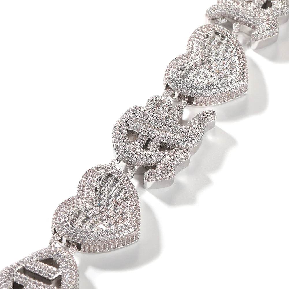 This eye-catching necklace features a chunky 26mm Cuban link chain, accented with a dazzling iced-out heart and vintage-style lettering, all encrusted with 3A CZ stones for a radiant, diamond-like shine.