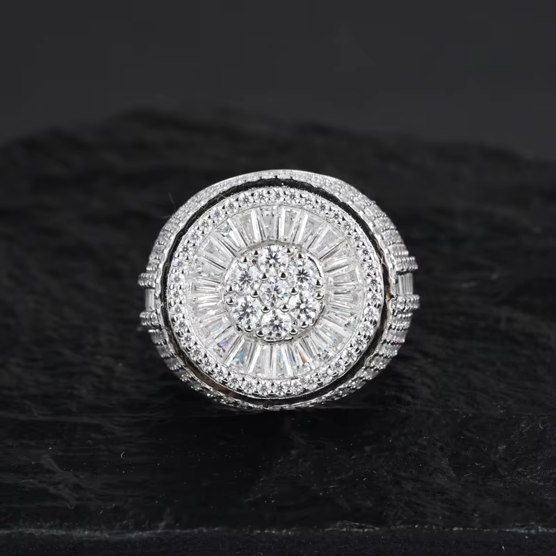 Stand out from the crowd with the Sparkling Rapper Jewelry for Men – Micro VVS D Round Baguette Moissanite Ring, designed to shine just like a diamond.