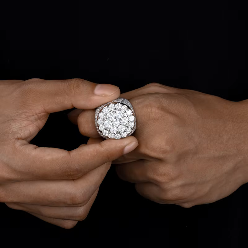 Add a touch of luxury to your collection with the Luxury VVS Round Brilliant Cut Moissanite Flower Ring. This striking 925 sterling silver ring features a beautiful round flower design, intricately set with VVS Moissanite stones in a pave setting. The brilliant sparkle of the round brilliant cut Moissanite offers a dazzling effect, mimicking diamonds without the high cost. Perfect for hip hop enthusiasts and those who appreciate luxury jewelry, this iced-out ring is ideal for making a bold statement.