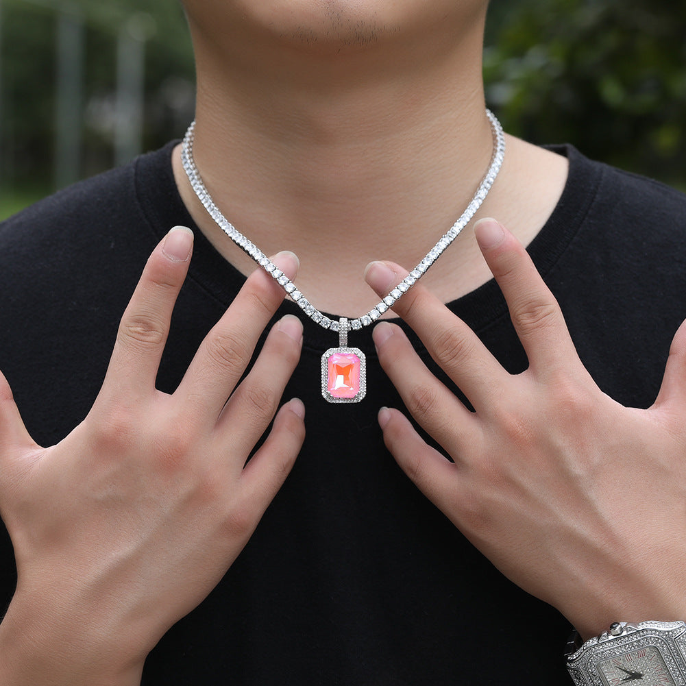 White Gold Light Blue & Pink Gem Rectangle Pendant – 5A CZ Iced Out Hip Hop Necklace