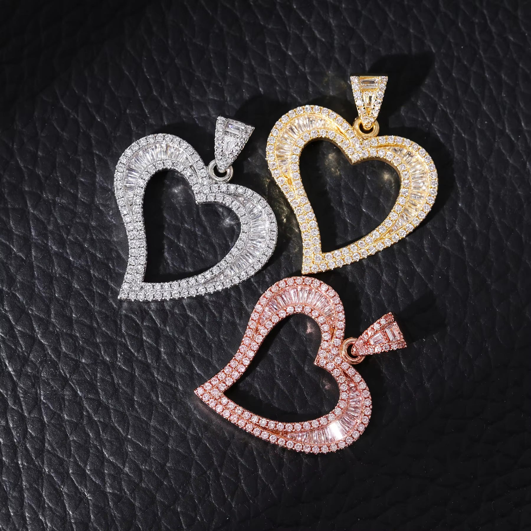 At the center of the design is a heart-shaped pendant encrusted with premium 5A cubic zirconia stones in princess and baguette cuts, all secured with high-precision claw setting to ensure maximum brilliance and durability. Whether you pair it with a rope chain for that classic street look or a tennis chain for extra sparkle, the HHP457 is made to elevate your outfit instantly.